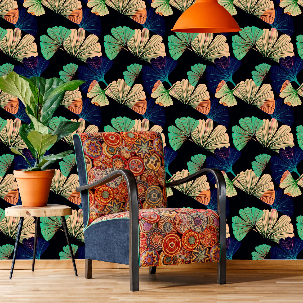 It has a gorgeous palette of black, indigo, mint green and coral. It looks amazing as a feature wall or in an entire room to bring a sense of colour and freshness.Â