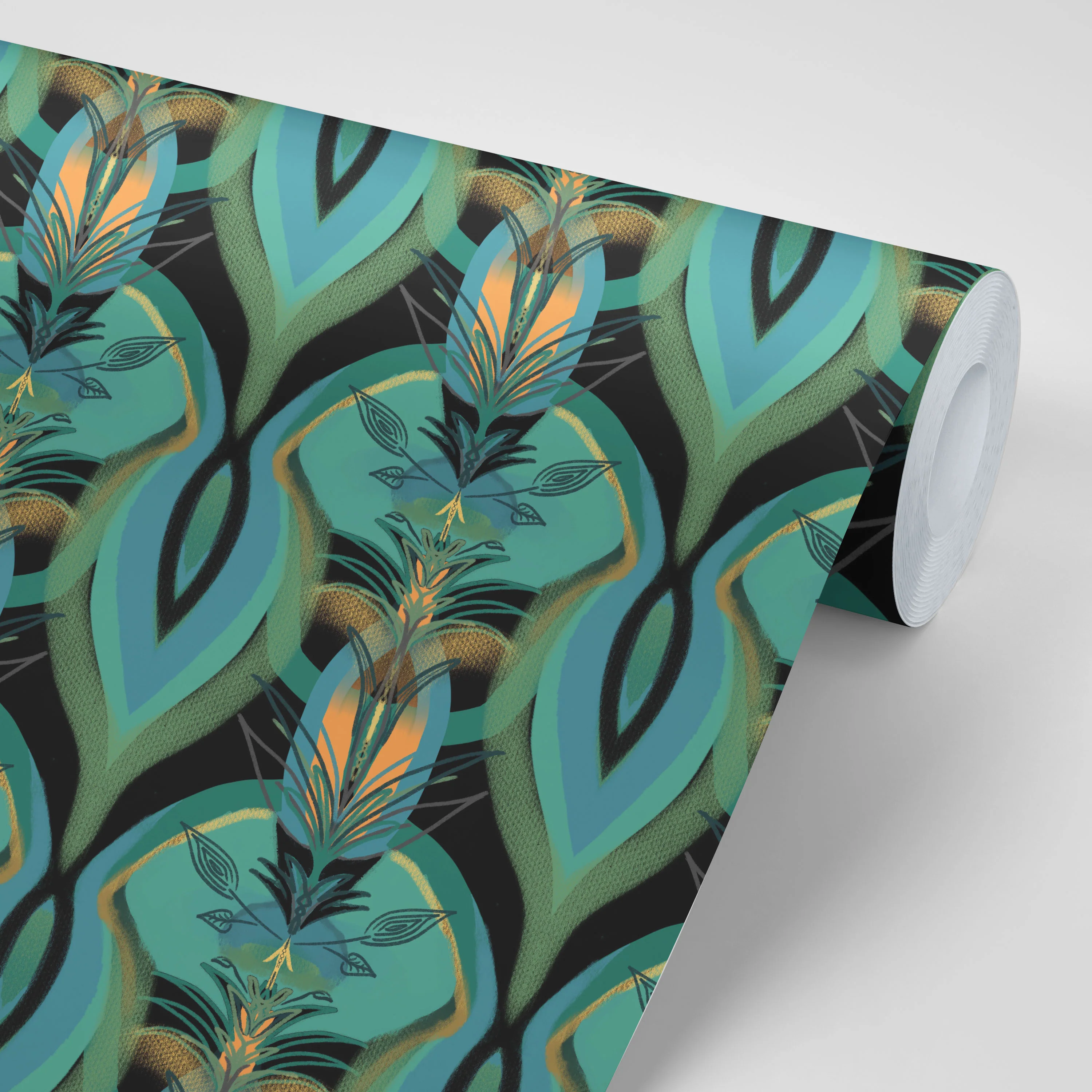 With an Art Deco feel, this rich luxurious collection, Soltar, uses dramatic colour and textures to create a rich pattern of inky black, teal and gorgeous greens, with a touch of peach.